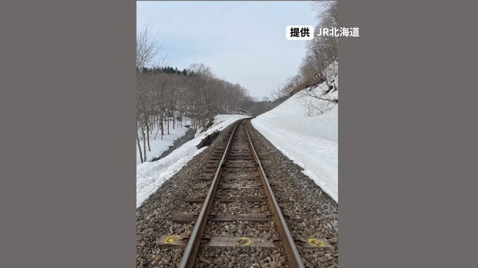 JR北海道によりますと、3月31日午後4時前、JR函館線の熱郛駅と目名駅の間で、線路脇の盛り土が約20メートルにわたって浸食しているのを、線路を調査していた職員が見つけました。