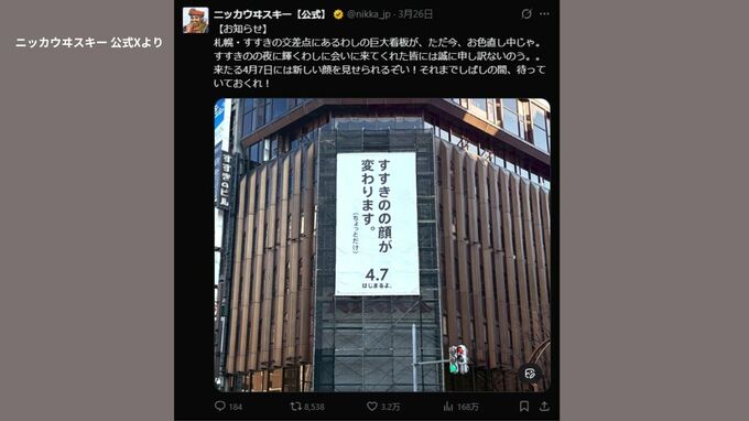 【お知らせ】札幌・すすきの交差点にあるわしの巨大看板が、ただ今、お色直し中じゃ。すすきのの夜に輝くわしに会いに来てくれた皆には誠に申し訳ないのう。。来たる4月7日には新しい顔を見せられるぞい!それまでしばしの間、待っていておくれ!