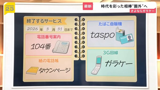 時代の流れとともに終了するサービスには3G回線のガラケーをはじめ、電話番号案内(104番)や紙の電話帳「タウンページ」、たばこ自販機「taspo」などがあげられます。