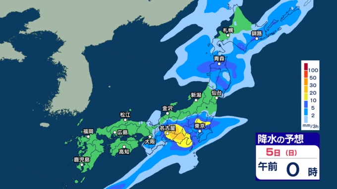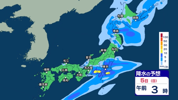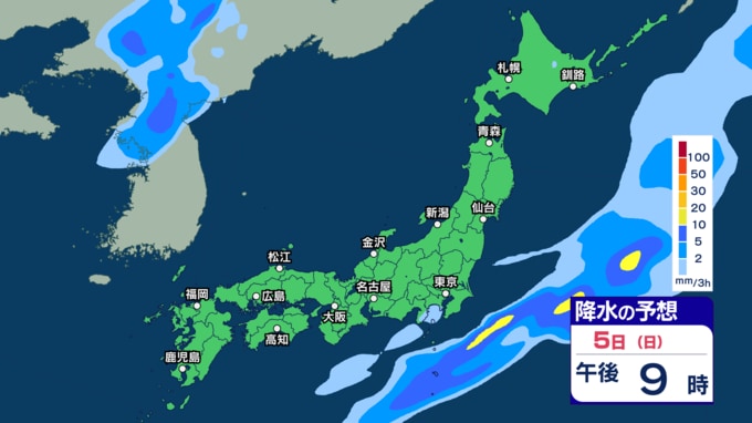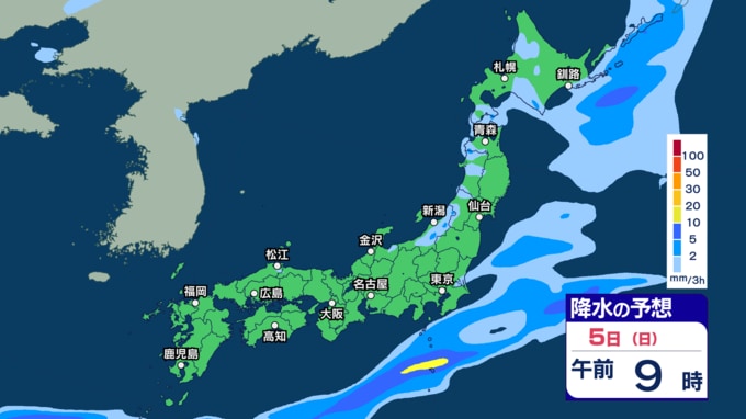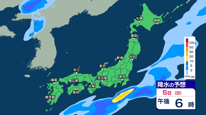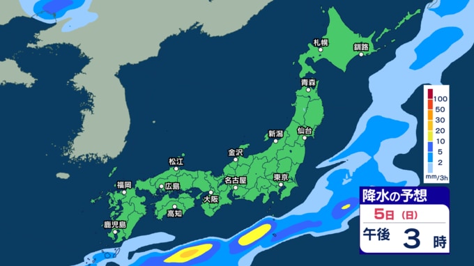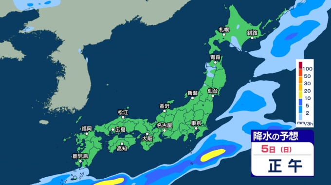 あす2日にかけて雷伴い激しい雨のところも 3日(金)は“貴重な晴れ間”も4日(土)以降は再び激しい雨か【1日~6日午後3時の雨シミュレーション・1日正午更新】 新潟放送 2026年4月1日(水) 12:00 5日(日)の雨(降水)のシミュレーション