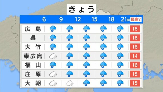 きょう1日(水)の広島県内は、分厚い雲が広がり、冷え込みの弱い朝となりました。小雨が降っているところもあります。沿岸部では10℃を下回らず、一番低くなった庄原市高野町でも7.4℃までしか下がっていません。