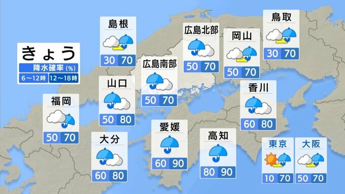 現在、日本の南には前線が停滞していて、ぐずついた天気となっています。前線上の低気圧は、午後に四国沖を通過する見込みで、県内でも夕方以降雨脚が強まるタイミングがありそうです。気温の上がり方はにぶく、最高気温は15~16℃の予想です。