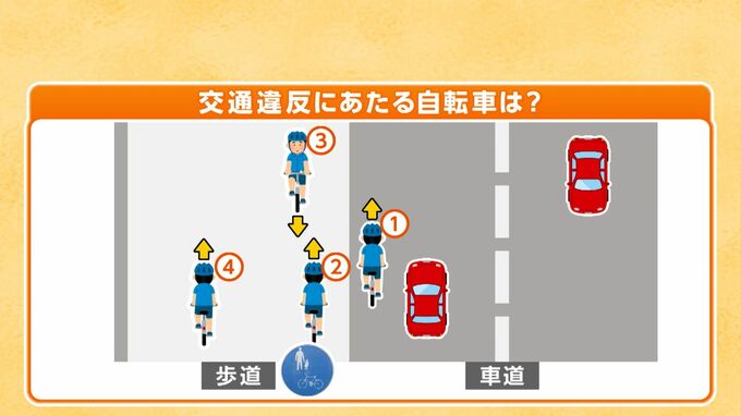 では続いて問題です。自転車の通行が許されている歩道でも、図の中の走行だと違反にあたる自転車があります。それは1から4のうち一体どれでしょうか?