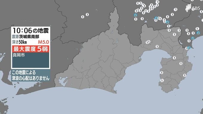 気象庁によりますと、震源地は茨城県南部で、震源の深さは約50km、地震の規模を示すマグニチュードは5.0と推定されます。