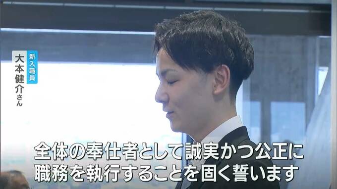 新入職員を代表し、大本健介さんが宣誓しました。近年、転職市場が活発化していることなどを受け、県庁でも退職者は増加傾向にあります。これを受け、県は試験の回数を増やしたり、年齢制限を広げたりといった積極採用を行ない、今年度は過去20年で最多となる221人の新入職員を採用しました。
