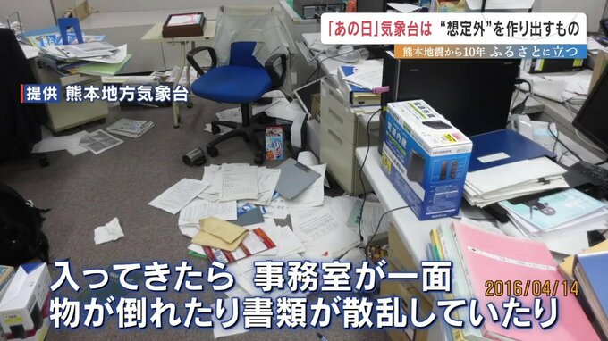 熊本地方気象台 松下光広さん「入ってきたら、事務室が一面、物が倒れたり書類が散乱してたり、そういう状況でした。まず心配したのは、すぐ業務ができるか」