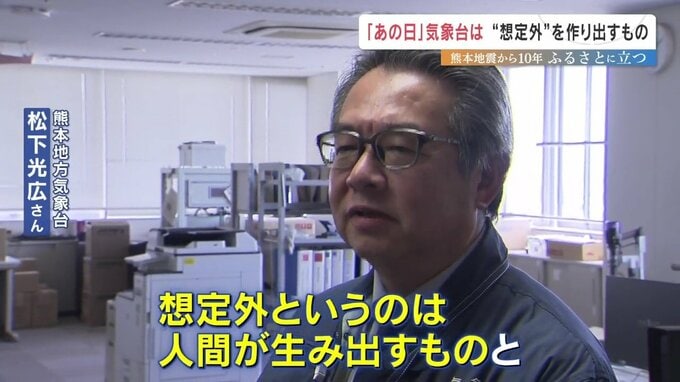 熊本地方気象台 松下光広さん「布田川断層や日奈久断層で想定される地震は、当然知識としてはあったんですけど、この地震に自分が遭遇するということは全然思っていなくて。想定外というのは人間が生み出すものかなと改めて思い知らされた地震だった」