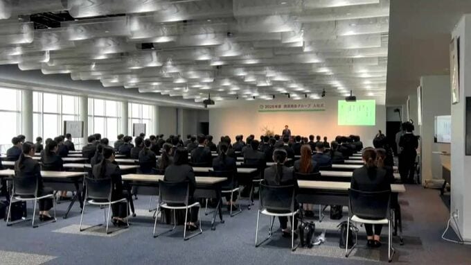 鹿児島市に本社を置き、業務用食品の卸売などを手がける西原商会グループの入社式です。韓国やネパールなど外国人6人を含む102人が入社しました。