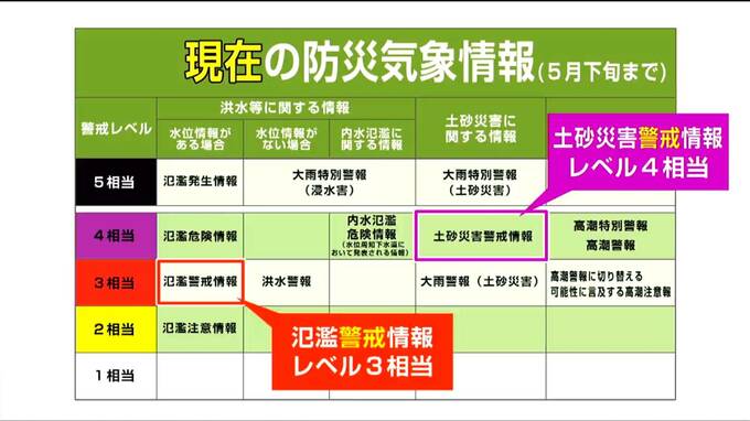 同じ「警戒情報」なのに、土砂災害はレベル4、河川氾濫はレベル3なのです。
