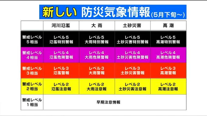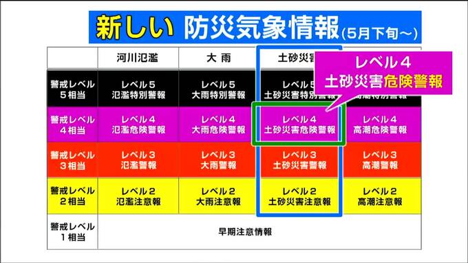 このようにレベルと危険度を一致させました。何の災害に対して、どの程度のレベルで危険なのかをわかりやすく表現できるようにしたのです。例えば、5月下旬以降、「レベル4大雨危険警報」と発表されたら、大雨についてレベル4相当の危険が迫っていることを意味します。専門家は色に注目してほしいと呼びかけています。