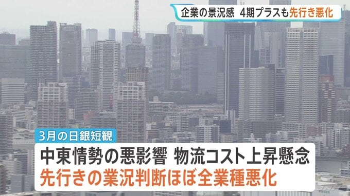 原油価格の上昇などは企業の景況感にも影響しています。日銀による企業調査「日銀短観」では、先行きの見通しが悪化しました。日銀が企業の景況感を調べた3月の「短観」で、現状が「良い」と答えた企業の割合から…