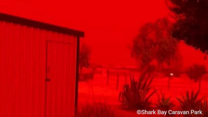 雲を通した柔らかく均一な光が、空中に充満した赤い砂ぼこりを照らしたため、砂ぼこりそのものが持つ「真っ赤な色」だけが浮かび上がった結果、空全体が血の色に染まって見えたというわけです。