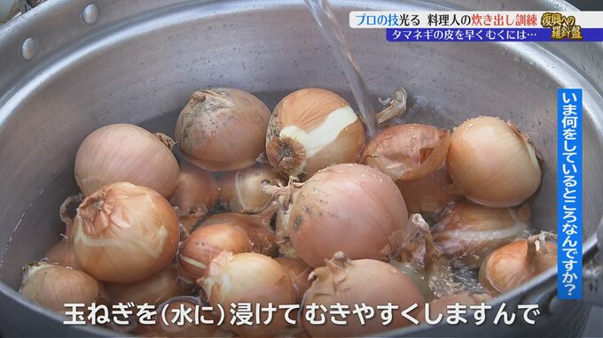 「タマネギを(水に)浸けてむきやすくしますんで。水に浸けておくと、隙間に水が入ってペロペロむけるんですよ」