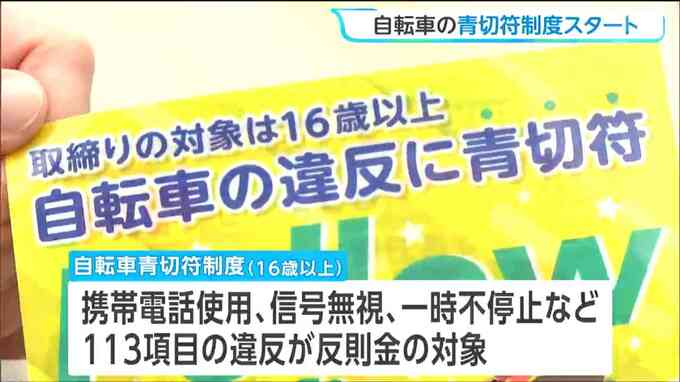 青切符制度は16歳以上が対象で、自転車に乗りながらの携帯電話の使用や信号無視、一時不停止など113項目の違反が反則金の対象になります。