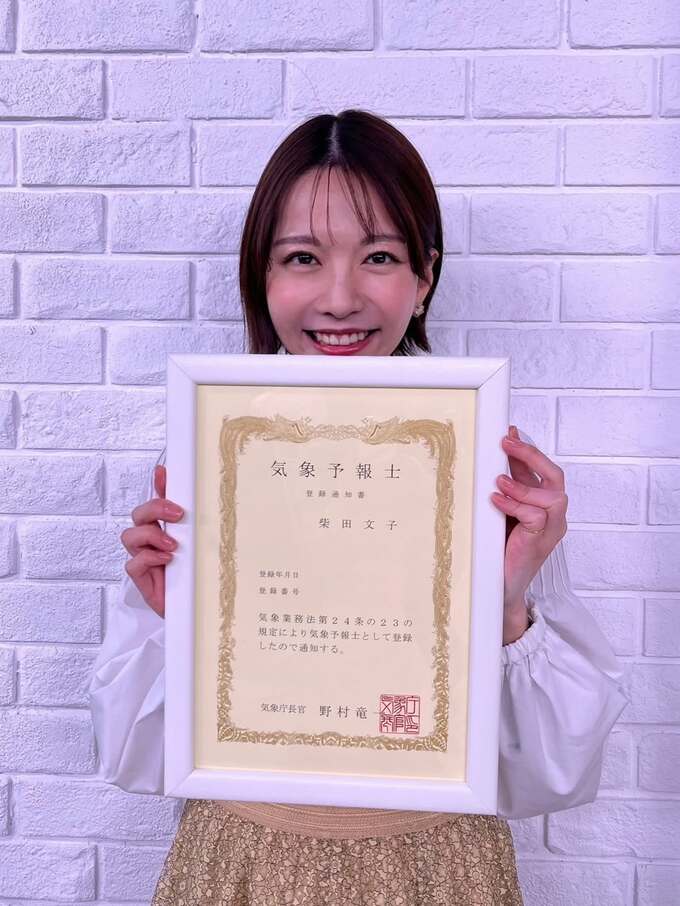 柴田さんは「このたび、第65回気象予報士試験に合格しました」と綴り、気象予報士の登録通知書を手に笑顔の画像を投稿。