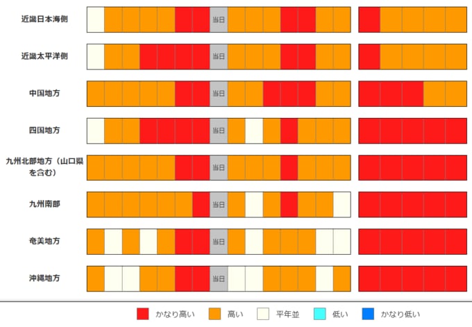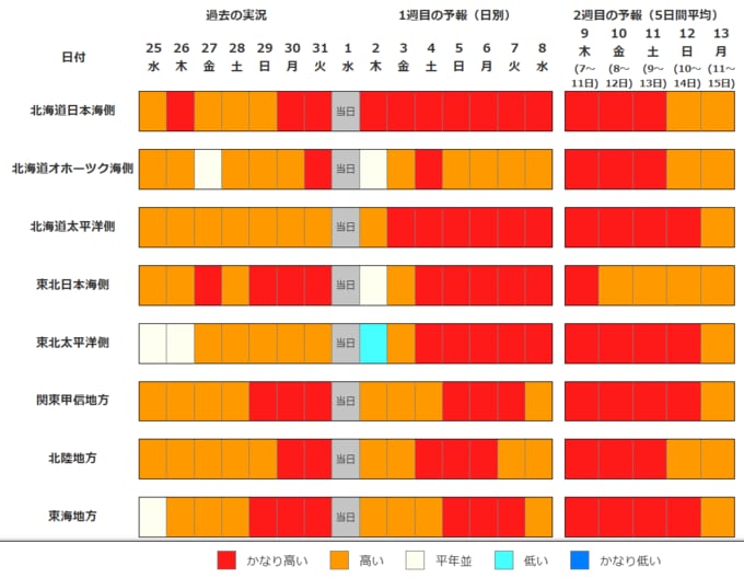 北・東日本の向こう2週間の気温は、暖かい空気が流れ込みやすいため高く、かなり高い日が多い見込みです。農作物の管理等に注意してください。西日本と沖縄・奄美の向こう2週間の気温は、暖かい空気が流れ込みやすいため高い日が多く、7日頃からはかなり高い日が多いでしょう。農作物の管理等に注意してください。