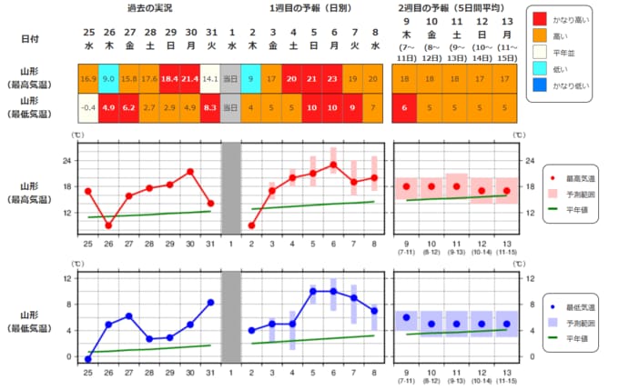 ・最近1週間の実況と今後2週間先までの気温の推移を表示しています。