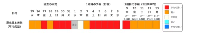 ・2週目の予報は中心の日に前後2日間を加えた5日間の平均(最高気温の5日間平均、最低気温の5日間平均、平均気温の5日間平均)です。平均期間を中心の日の下に表示しています。2週目のかなり高い(かなり低い)は、かなり高い(かなり低い)気温となる確率が30%以上のときに表示します。