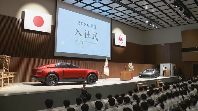 晴れの会場でエンジン音が鳴り響いたのは、約2300人が参加したトヨタ自動車の入社式。「GR GT3」や「センチュリー」が壇上を飾り、新入社員たちが目を輝かせました。