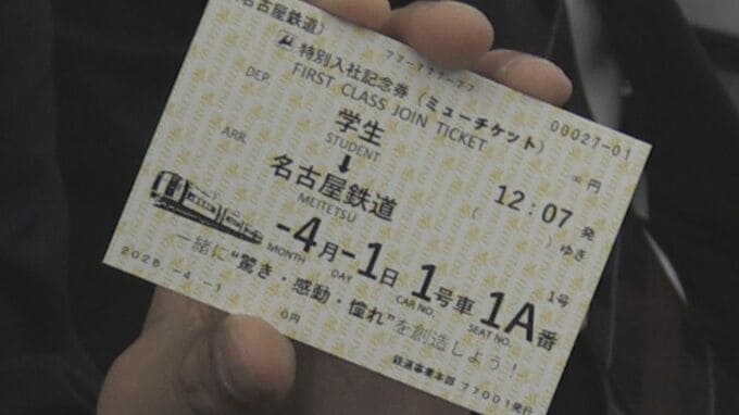 車内アナウンスを体験したり、名鉄「ミュースカイ」で必要な特別乗車券になぞらえ「特別入社券」が配られました。