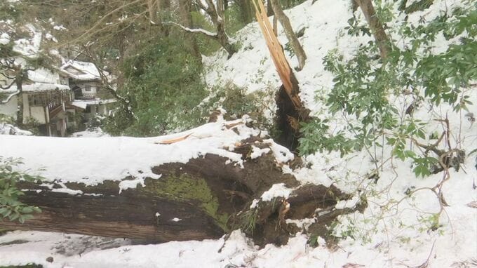 2月7日からの大雪で樹齢700年、高さ20メートルのスギの古木が倒れて参道をふさぎ、近くの旅館の屋根を壊しました。