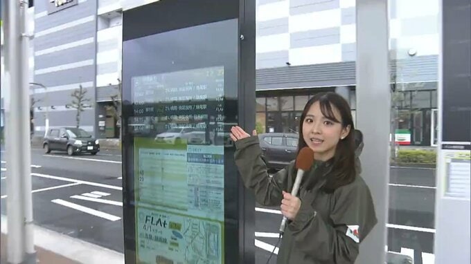 「大型商業施設の前にあるこちらの乗継拠点。きょう(1日)のような天候の悪い日でも、雨がしのげる屋根があります。そしてこちらにはデジタルサイネージが設けられていて、このあと来るバスの時刻が分かりやすくなっています」