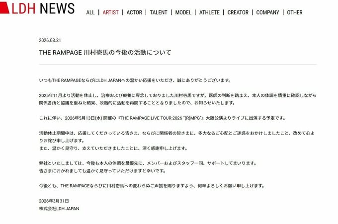 去年11月から精神面の不調が確認され、活動を休止しているTHE RAMPAGEの川村壱馬さんが、活動を再開させることが、所属事務所『LDH』の公式サイトで発表されました。