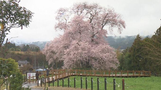 矢祭町のサクラの名所、戸津辺の桜。樹齢600年を超えるとされるエドヒガンザクラで、高さはおよそ18メートル、幹回りはおよそ6.5メートルと、歴史を感じさせる荘厳な出で立ちです。今年は例年より4日早く開花し、3月30日に満開となりました。