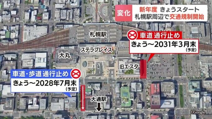 さらに、札幌駅前通では地下鉄南北線さっぽろ駅のホーム増設工事のため、1日から2028年7月まで一部の区間で東側の車線と歩道が通行止めになります。