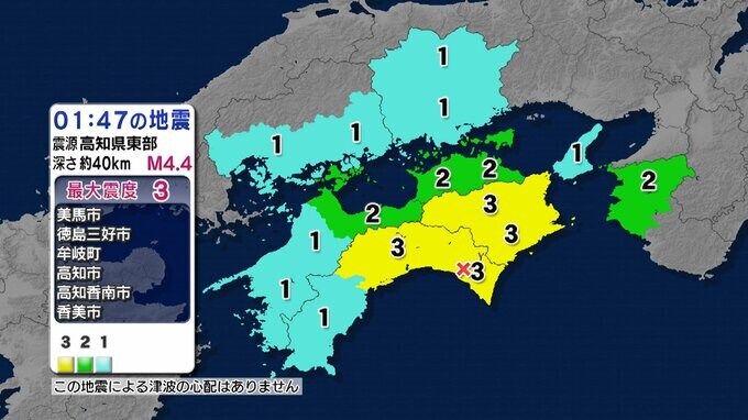 29日未明、高知県東部を震源とする地震があり、高知県内7市町村で震度3の揺れを観測しました。この地震による津波はなく、被害の情報も入っていません。地震は午前1時47分ごろ発生。各地の震度は高知市、香美市、…