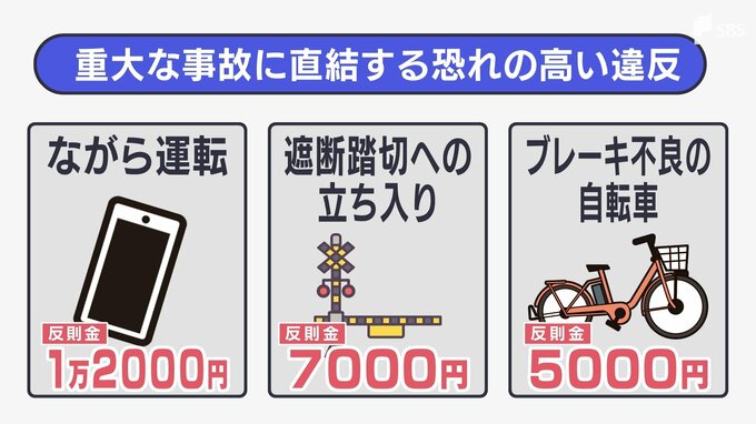 ▼ながらスマホ▼遮断踏切への立入り▼ブレーキ不良など、反則行為の中でも、重大な事故に直結するおそれが高い違反が青切符の対象になります。
