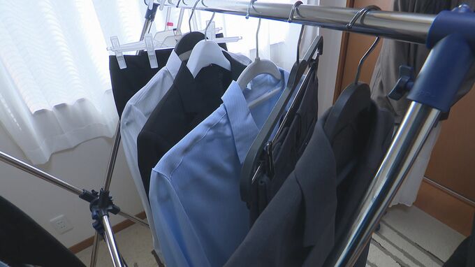 後綾香さん「こっちが最近入庁するときのために買ったスーツ。あっちが一応オフィスカジュアルで使えそうな服をそろえてみました」「着てみて自分が似合いそうな服。あと色を変えてみたり。黒と濃いめのグレーにして着まわせるように」
