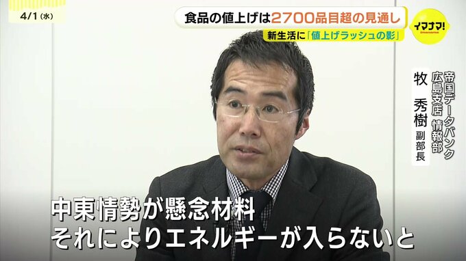「依然として高止まりはしているので、今後も、下がることはなく、上がることはある。やはり中東情勢が懸念材料です。それによってエネルギーが入ってこないってことになると、やはり包装資材のさらなる値上げや、製造コストのアップが考えられます。今は在庫があると思うが、夏場以降、商品の値段に跳ね返ってくる、値上げ品目が当初想定より増える可能性を懸念しています」