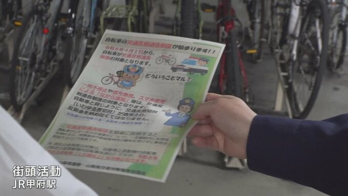 イヤホン装着5000円など 自転車の交通違反に反則金 制度を周知する街頭活動 JR甲府駅前 テレビ山梨 2026年4月1日(水) 18:31 国内 また、イヤホンをつけたまま自転車を運転しようとした人に注意を促しました。 青切符は16歳以上が対象で悪質で危険な自転車の交通違反に対し反則金を科します。