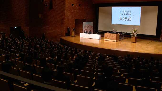 福岡銀行の五島久頭取は九州交響楽団の演奏に合わせて新入行員244人を前にドラムを叩き、自慢のスティックさばきを披露しました。