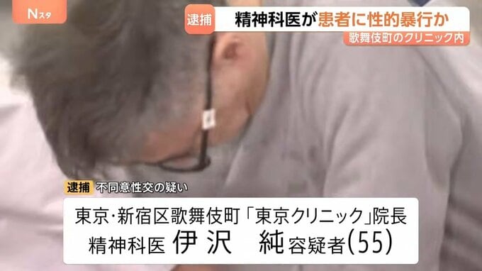 不同意性交の疑いで逮捕されたのは、新宿区歌舞伎町にある「東京クリニック」の院長、精神科医の伊沢純容疑者(55)で、去年8月、クリニックで患者の20代の女性に性的暴行を加えた疑いがもたれています。