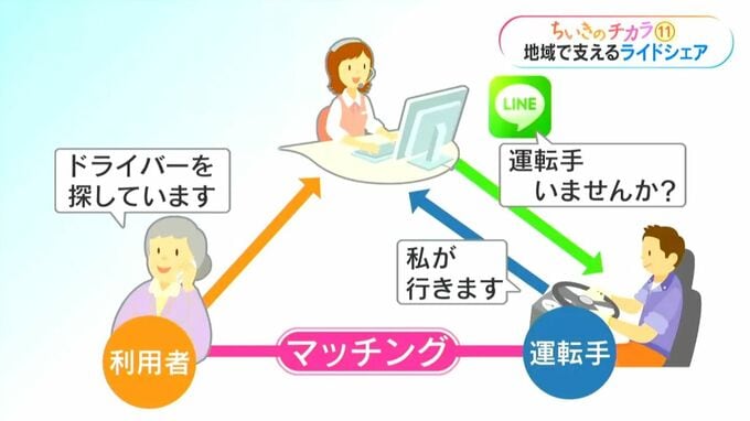 利用者はまず、コールセンターに電話をかけドライバーを探してもらいます。LINEグループを通して運転手を探し無事に見つかるとマッチング成功。あとは車の到着を待つだけです。