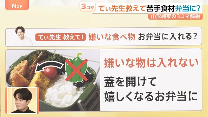 てぃ先生によりますと「嫌いなものはお弁当には入れない。蓋を開けて、嬉しくなるお弁当に」ということです。