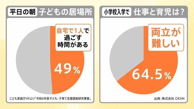 ある調査によると、▼「平日の朝、子ども1人だけで過ごす時間がある」と答えた家庭は49%、▼「小学校入学で仕事と育児の両立が難しい」と答えた家庭は64.5%になったということです。