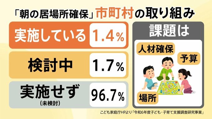 しかし、このような『朝の居場所確保』を実施している市町村は1.4%、検討中は1.7%、実施せず(未検討)は96.7%と、まだまだ多くはありません。
