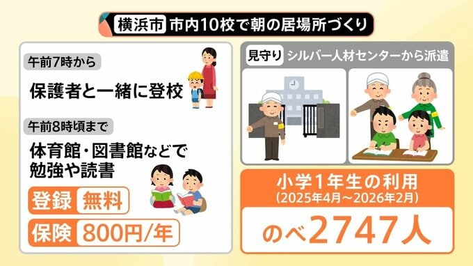 自治体では様々な取り組みを行っているようです。横浜市では市内10校で『朝の居場所づくり』として、午前7時から保護者と一緒に登校し、午前8時までは体育館や図書館などで勉強や読書ができるということです。登録は無料で、保険は年800円に設定しています。