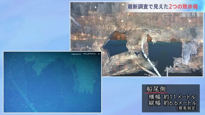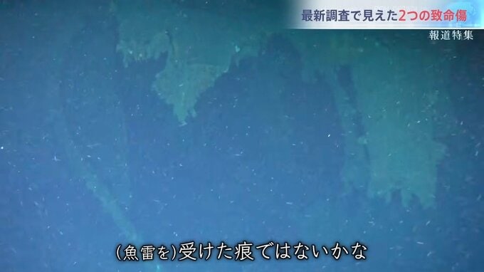 「おそらく(魚雷が)当たって中で爆発したときの痕ではないかなと推測されます。外板が外に向いているのではないかと」