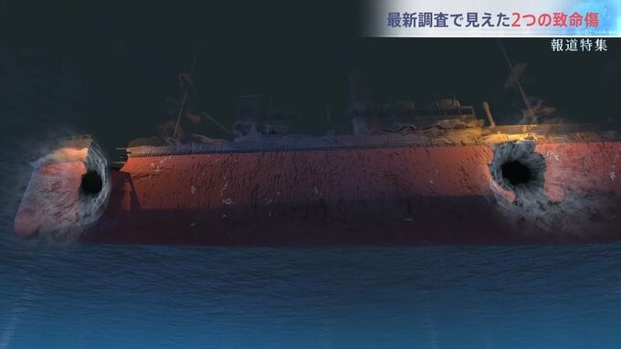 子どもたちが深い眠りについていた夜中に10分ほどで沈没したという対馬丸。この2つの穴が致命傷になったとみられる。