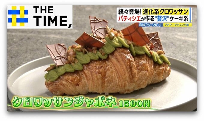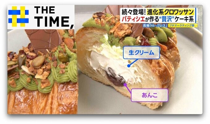 一番人気の「クロワッサン ジャポネ」(1500円)は、抹茶のクリームやナッツ、チョコレートでデコレートされた進化系クロワッサン。中には、あんことたっぷりの生クリームが入っています。