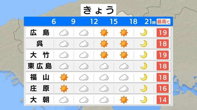 きのう天気を崩した前線や低気圧は東へと進み、この後はゆっくりと回復してくる見込みです。ただ、上空の高いところには寒気が残っていて、大気の状態が不安定になりやすくなっています。きょうは日差しがあっても、急なにわか雨にご注意ください。山沿いでは雷を伴うところもあるでしょう。最高気温は、広島19℃、呉・福山18℃、庄原18℃の予想です。