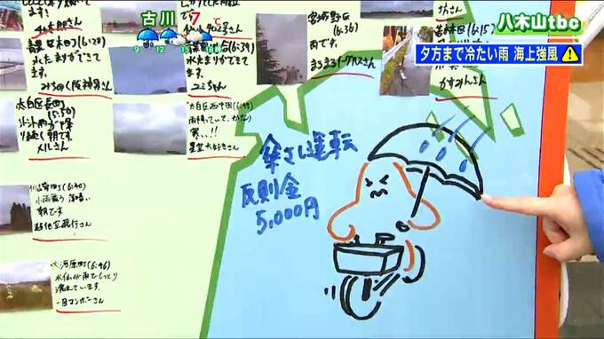 車や自転車の運転は、普段以上に慎重に行ってください。なお、1日から自転車への「青切符制度」が導入されており、傘差し運転は反則金5,000円の対象となります。(星野予報士のオリジナルキャラクターのホッシー?くん、いけないですよ~)