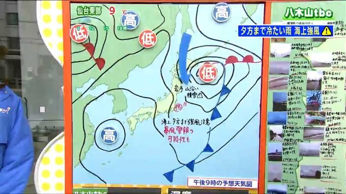 4月2日(木)の宮城県内は、発達中の低気圧の影響で広い範囲にわたって雨が降っています。最高気温は10℃に届かないところが多く、3月上旬並みの肌寒さとなる見込みです。海上では北寄りの風が強まり、暴風警報が発表されるおそれもあります。
