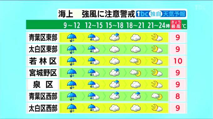 ■青葉区東部:9℃ ■青葉区西部:8℃ ■若林区:10℃