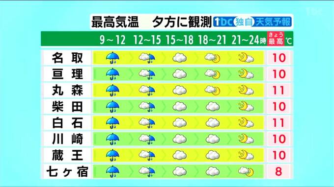 南部は雨が止むのが比較的早く、夕方には最高気温が10℃前後まで上がる見込みです。