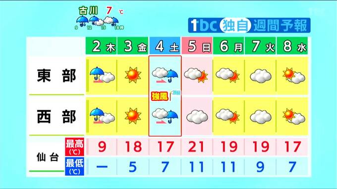 4日(土)は低気圧や前線の影響で午後から雨が降ったり止んだりとなり、南風が強く吹いて荒れた天気となるおそれがあります。そして5日(日)は、再び晴れ間が戻り、最高気温が2026年で初めて20℃を上回るところも出てくる見込みです。